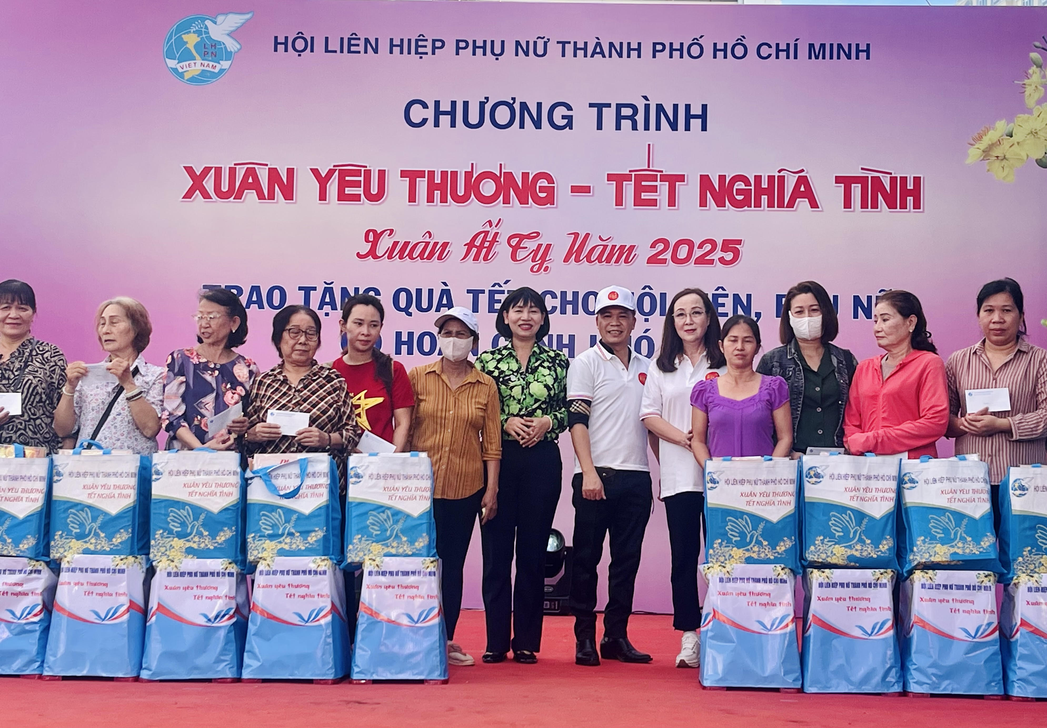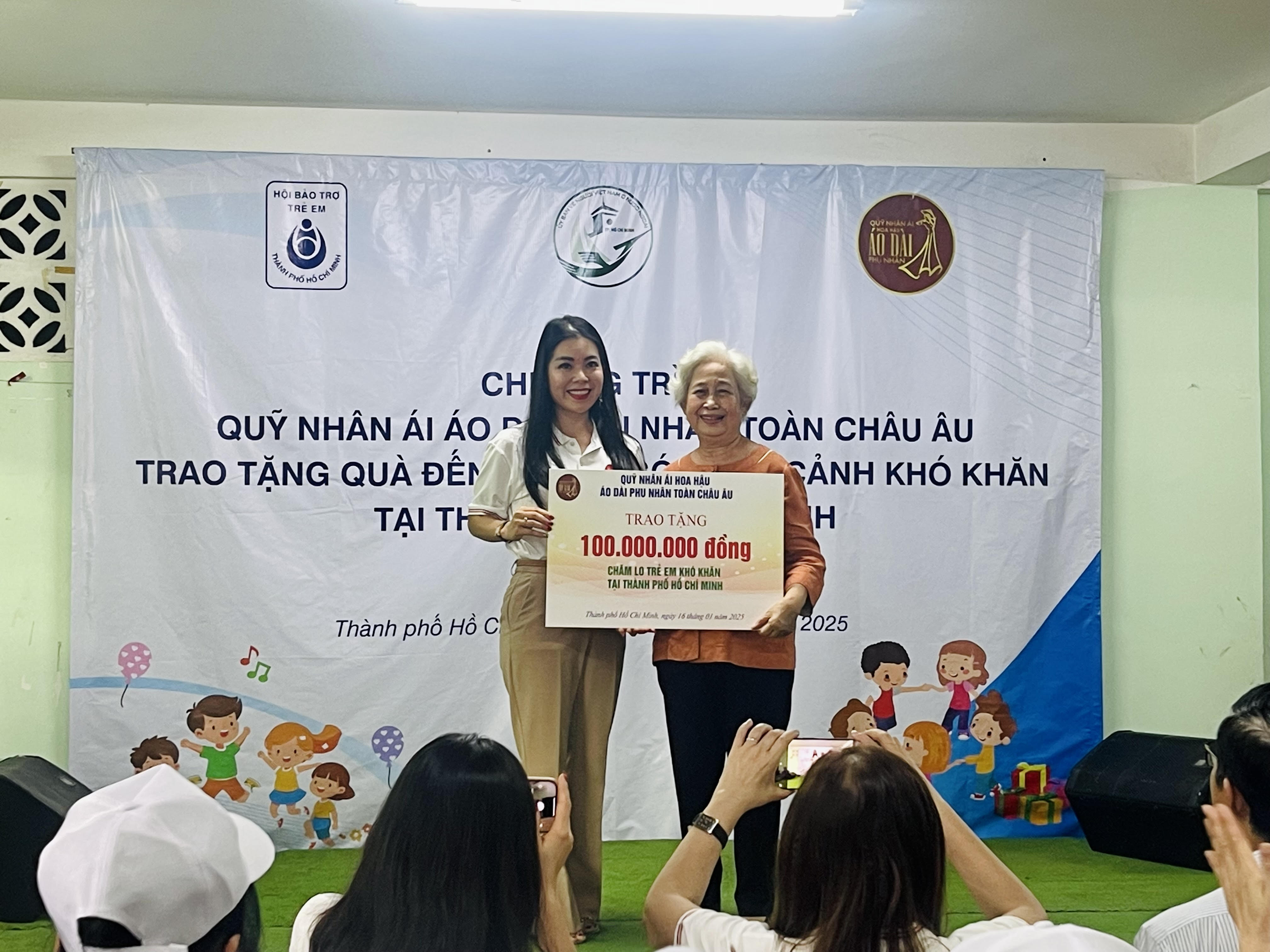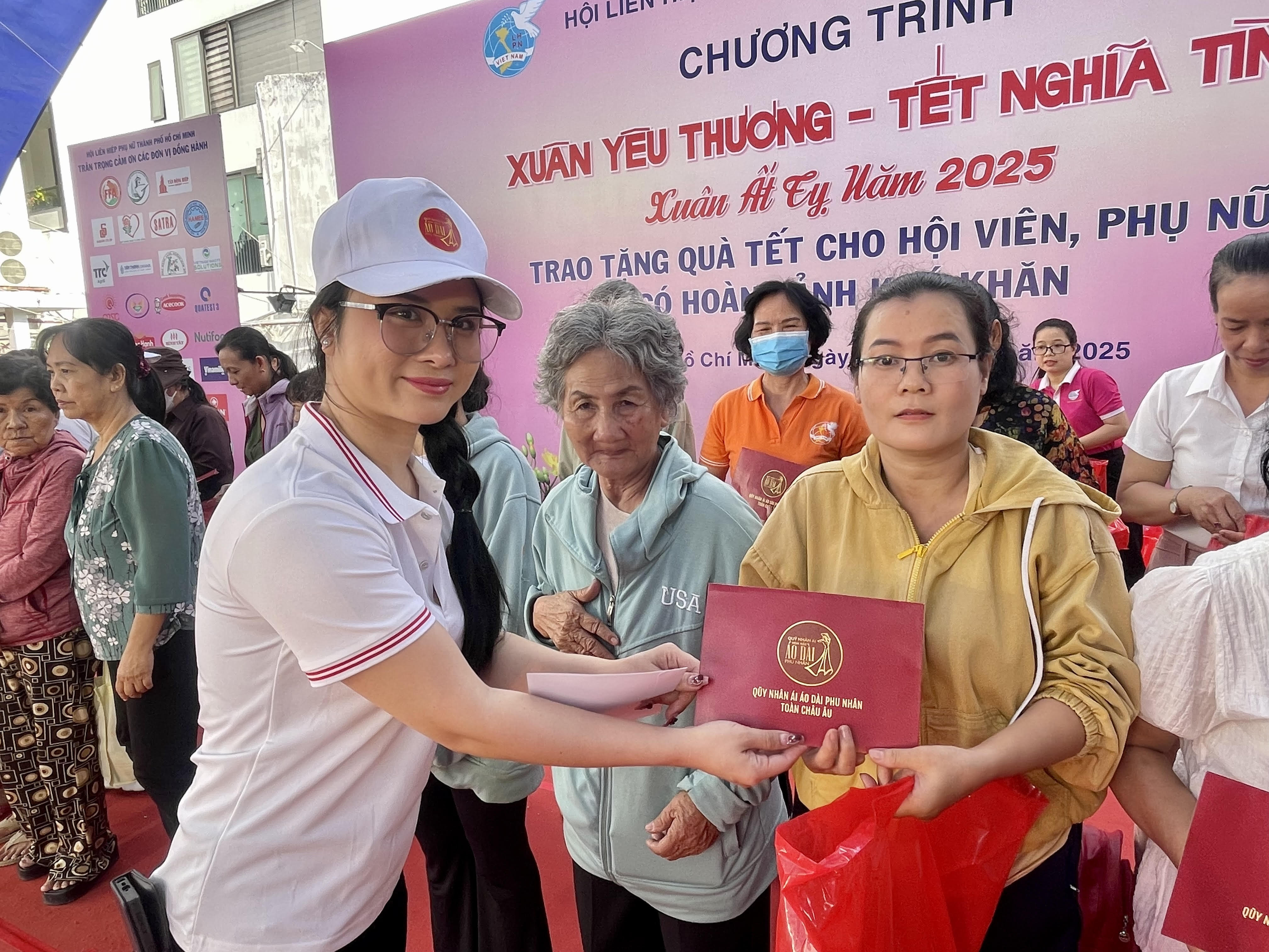 Chung tay cùng các tổ chức, đơn vị của địa phương, Quỹ nhân ái – Hoa hậu Áo dài phu nhân toàn Châu Âu đã trao 100 phần quà bao gồm tiền mặt và hiện vật cho các chị em gặp hoàn cảnh yếu thế. Bà Trần Thị Phương Hoa, Phó chủ tịch Hội Liên hiệp phụ nữ Thành phố Hồ Chí Minh, bày tỏ: “Những món quà xuân không chỉ là vật chất và còn là tình cảm sẻ chia, kết nối yêu thương với mong muốn mang đến một cái Tết thật đầm ấm, trọn vẹn nghĩa tình của các cấp hội đến với mọi gia đình, đến với mọi người, trong đó có hội viên, phụ nữ có hoàn cảnh khó khăn trên địa bàn thành phố. Đặc biệt năm nay có sự tham gia của Quỹ nhân ái Hoa hậu áo dài phu nhân toàn châu Âu, thể hiện tinh thần đoàn kết giữa chị em phụ nữ trong nước và trên toàn thế giới – điều đó thật đáng quý”.