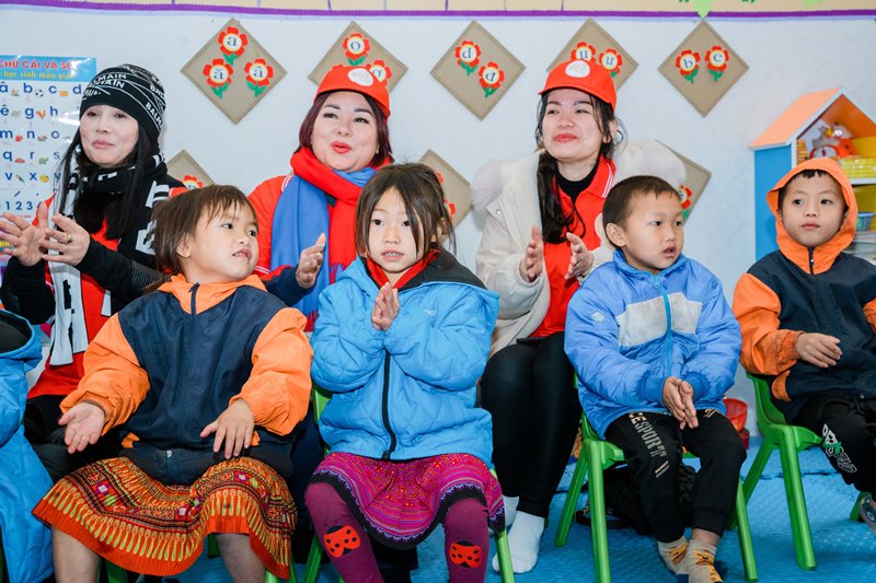 Các vị khách từ phương xa cùng hát chung bài ca với các em nhỏ điểm trường mầm non Suối THín |