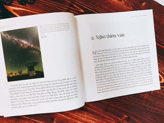 Lồng ghép trong các trang kiến thức là hệ thống ảnh minh họa đặc sắc những bức ảnh màu do chính tác giả dày công tuyển chọn; đem đến cảm nhận phong phú, rộng mở về những điều kì diệu trong Vũ trụ.