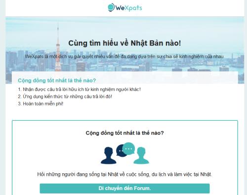 Công ty Cổ phần Leverages của Nhật Bản vừa chính thức ra mắt phiên bản tiếng Việt của trang thông tin “WeXpats” dành cho những người Việt Nam quan tâm tới Nhật Bản. Đây là một diễn đàn trực tuyến giúp giải quyết các vấn đề liên quan đến cuộc sống tại Nhật Bản thông qua việc chia sẻ kinh nghiệm giữa các thành viên.