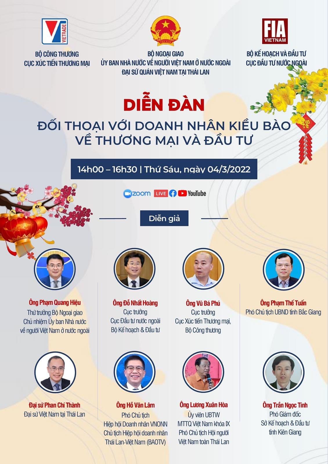 Nhằm cung cấp thông tin về chính sách khuyến khích thương mại và đầu tư, kết nối các doanh nghiệp kiều bào với trong nước, cũng như thảo luận, giải đáp thắc mắc cho cộng đồng, Ủy ban Nhà nước về người Việt Nam ở nước ngoài, Bộ Ngoại giao phối hợp với Đại sứ quán Việt Nam tại Thái Lan, Cục Xúc tiến thương mại - Bộ Công Thương và Cục Đầu tư nước ngoài - Bộ Kế hoạch và Đầu tư tổ chức Diễn đàn "Đối thoại với doanh nhân kiều bào về đầu tư và thương mại".