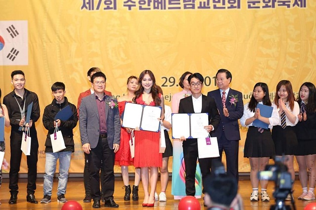 Ông Cao Minh Đức (thứ ba từ trái sang) phụ trách cộng đồng Đại sứ quán Việt Nam tại Hàn Quốc trao giải nhất cuộc thi tìm kiếm tài năng tại Lễ hội văn hóa Việt Nam tại Hàn Quốc lần thứ 7 năm 2017.