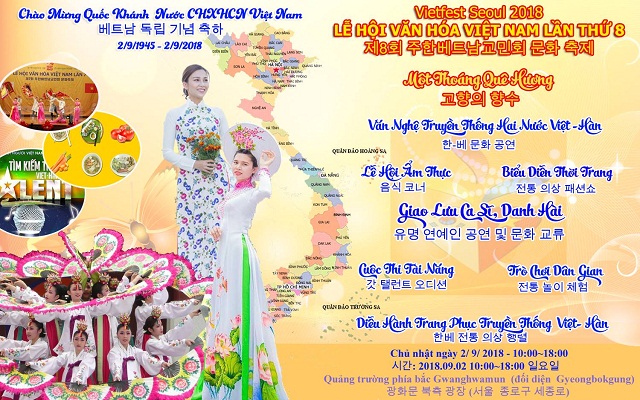 Dưới sự bảo trợ của Đại sứ quán Việt Nam tại Hàn Quốc, Hội người Việt Nam tại Hàn Quốc sẽ tổ chức chương trình Lễ hội văn hóa Việt Nam lần thứ 8 năm 2018 vào ngày 2/9 tới.