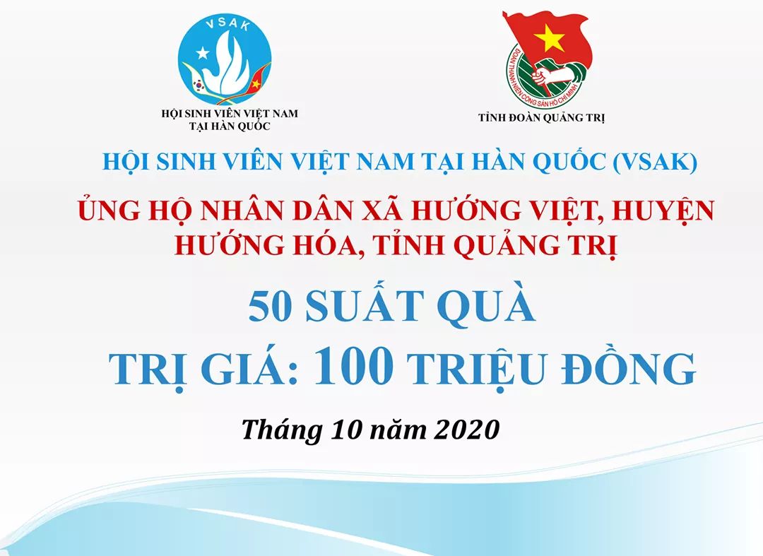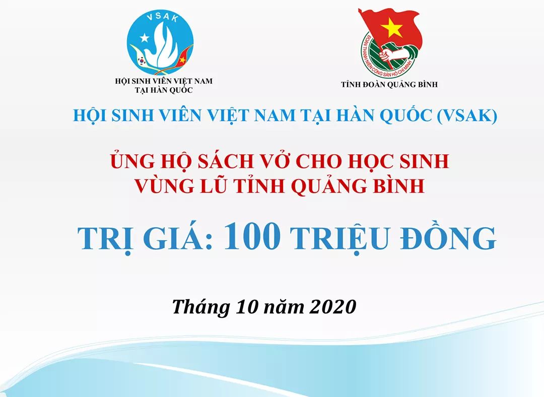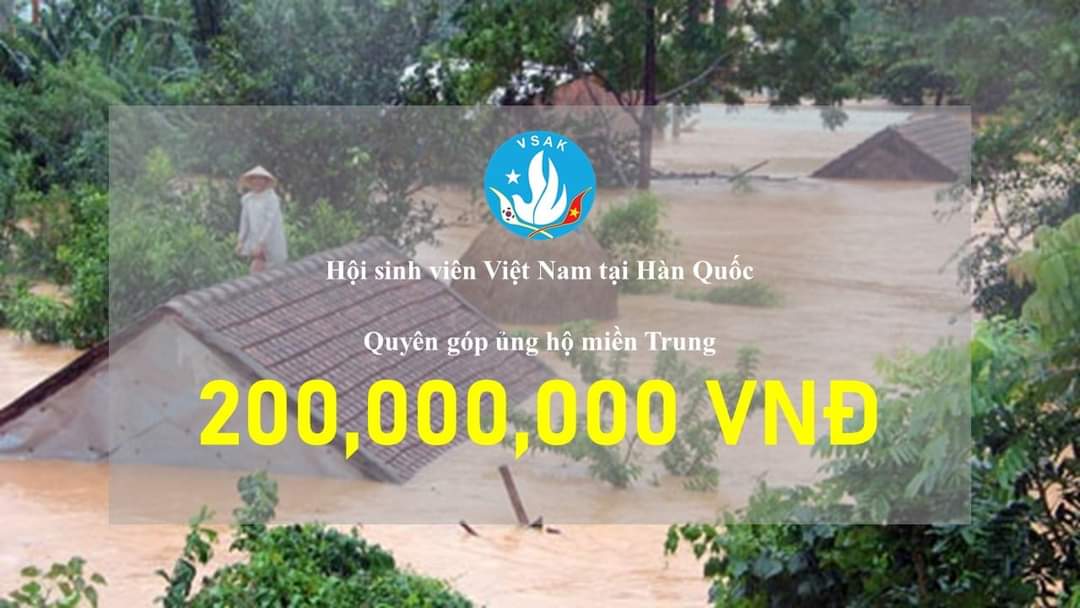 Trước tình hình bão lũ ảnh hưởng nặng nề đến các tỉnh miền Trung, sinh viên Việt Nam tại Hàn Quốc, thông qua Hội Sinh viên Việt Nam tại Hàn Quốc (VSAK), đã quyên góp, ủng hộ, chia sẻ khó khăn với đồng bào miền Trung với tinh thần tương thân, tương ái.