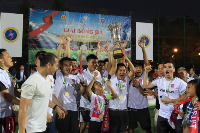 Các cầu thủ AFC Hà Nội vui mừng nâng Cúp chiến thắng của Giải bóng đá cộng đồng người Việt Nam tại LB Nga - Hè 2022. Ảnh: Trần Hiếu/PV TTXVN tại LB Nga |