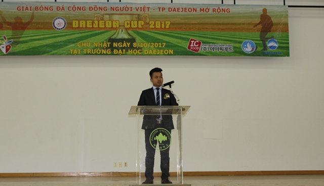 Anh Vũ Đức Lượng, Chủ tịch Hội người Việt thành phố Daejeon, Trưởng ban tổ chức, phát biểu khai mạc giải bóng đá.