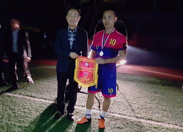 Giáo sư Park Kyun Ik, Giám đốc công ty ICFOOD, trao giải vua phá lưới cho anh Trần Huy Dũng, cầu thủ của đội Gunsan FC.