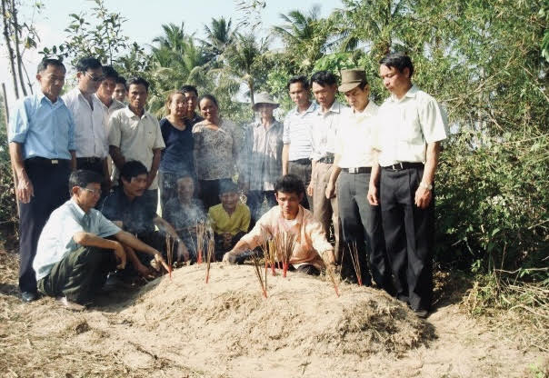 Cựu chiến binh Trần Hữu Quê (ngoài cùng bên phải) bên nấm mộ đồng đội cũ |