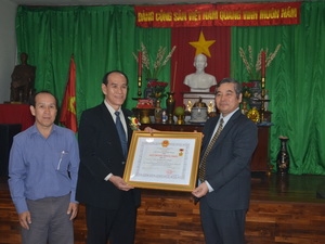 | Đại sứ Ngô Đức Thắng trao tặng Huy chương kháng chiến hạng nhất cho gia đình ông Ninh Viết Minh, Việt kiều ở Bangkok. (Ảnh: Lê Minh Hưởng/Vietnam+) |