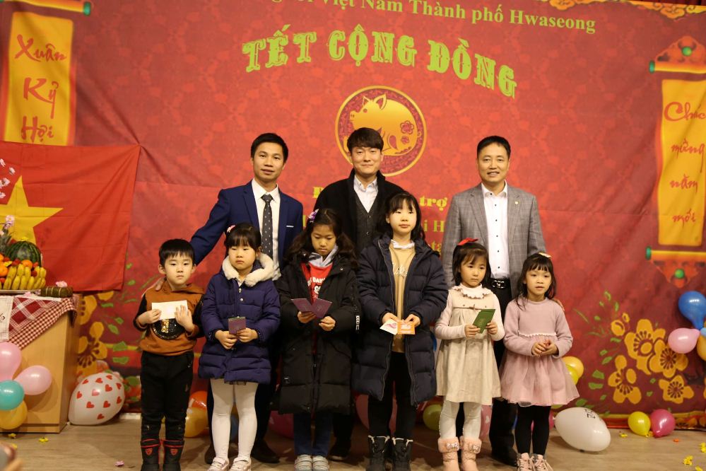 Những em nhỏ của các gia đình đa văn hóa được tặng tiền mừng tuổi nhân dịp năm mới. Anh Bùi Văn Hiếu (đứng ngoài cùng, bên trái), Phó Chủ tịch Hội, Trưởng ban tổ chức sự kiện, chia sẻ: “Sự kiện Tết cộng đồng mang đến một không khí ấm cúng, đoàn kết và làm vơi đi nỗi nhớ nhà, nhớ tết cổ truyền dân tộc Việt Nam. Qua chương trình này, bà con trong cộng đồng xích lại gần nhau hơn, cùng nhau chia sẻ những kinh nghiệm trong cuộc sống tại Hàn Quốc”.