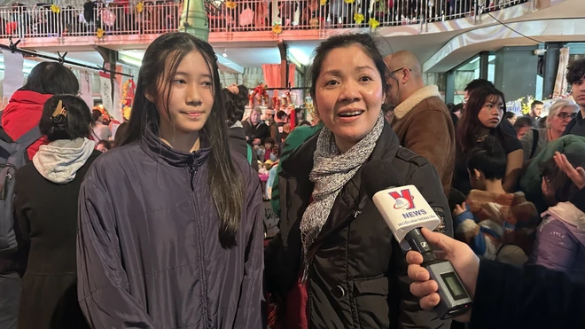 Chị Ngọc Hân, người Việt đang sinh sống tại Pháp, cùng con gái chia sẻ niềm vui mừng khi tới tham dự sự kiện. Ảnh: Ngọc Hiệp/TTXVN |