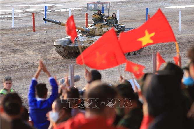Cổ động viên chúc mừng kíp xe tăng Việt Nam hoàn thành tốt bài thi bán kết, chiều 1/9, theo giờ Moskva. Ảnh: TTXVN |