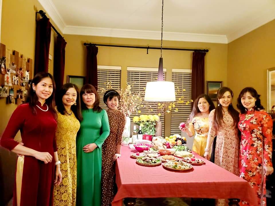Từ Dallas, bang Texas, chị Khuất Thanh Thúy gửi về quê nhà những bức hình áo dài mà chị mới chụp cùng mấy người bạn thân trong những ngày giáp tết. Chị Thúy tâm sự: "Năm nay là Tết covid đầu tiên nên nhiều Việt kiều, du học sinh hay những người đi làm xa nhà đều không về quê ăn tết được nên lại càng nhớ Tết của quê hương. Tết bên này chúng tôi không được nghỉ, nhưng may năm nay lại vào cuối tuần nên có nhiều thời gian hơn dành cho tết. Tuy nhiên dịch ở đây rất căng nên chúng tôi cũng rủ nhau mặc áo dài đi lễ chùa và đeo khẩu trang chứ không tổ chức tiệc như mọi khi. Mỗi nhà sẽ nấu vài món như gói bánh chưng, làm giò thủ, làm nem, rồi trao đổi với nhau để mâm cỗ tết được phong phú".