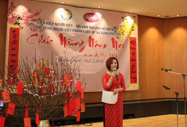 Sau lời giới thiệu của MC Anh Bằng, nghệ sĩ Bích Nga – Hội trưởng Hội văn hóa phụ nữ Mifafa lên phát biểu. Chị bày tỏ lòng cảm ơn tới Liên hiệp người Việt toàn Liên bang, tới những hội đoàn, cá nhân đã cùng giúp sức, hỗ chợ để tổ chức Lễ đón xuân.