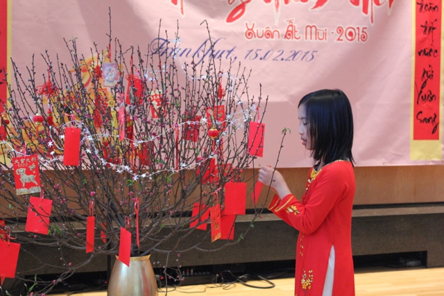 Không gian Tết Việt tràn ngập hội trường! Những cành đào được gửi từ quê nhà như còn đọng những hạt sương, như đang thả cái hồn Tết nơi quê nhà cho những người con xa xứ.