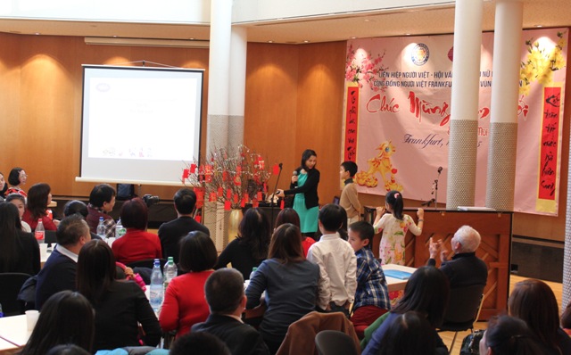 Cô Minh Hương thay mặt cho các cô giáo dạy tiếng Việt dẫn chương trình đã rất “đắt hàng” trước sự tham gia nhiệt tình của các cháu. Nhiều câu hỏi về Tết, về nguồn gốc, về các tập tục truyền thống, về ẩm thực ngày Tết, về hoa đào, hoa mai được trả lời chính xác.