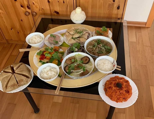 Trực tuyến là những từ chúng ta được nghe thấy suốt năm qua ở nhiều quốc gia trên thế giới. Dịch bệnh đã khiến cho người Việt không thể tụ họp như mọi năm để gói bánh chưng, để sum vầy, chúc Tết nhau và cùng hướng về quê hương. Không khí Tết của người Việt ở nhiều nước năm nay khá yên tĩnh và có thể nói là khá buồn do dịch bệnh, do thời tiết quá lạnh. Nhưng trong mỗi gia đình Việt, thời gian có nhiều hơn để chuẩn bị cơm Tết, rồi cúng tổ tiên. Chị Nguyễn Quỳnh Linh, người Việt ở Đức cho biết:“ Tại vì xa quê hương đã lâu nên cũng nấu giống như ngày trước thôi còn bây giờ ở Việt Nam nấu gì thì tôi cũng không biết. Cũng có canh măng, gà luộc, bát miến, nem, giò thủ, chả giò, bát bóng xào,xôi gấc, bánh chưng…món truyền thống. Năm ngoái, thì có bạn trai của con gái cũng là người nước ngoài về dự chung nhưng năm nay, thì cấm tất nhà nào ở nhà nấy thôi. Mình cũng thắp hương cho bà nội và bố”