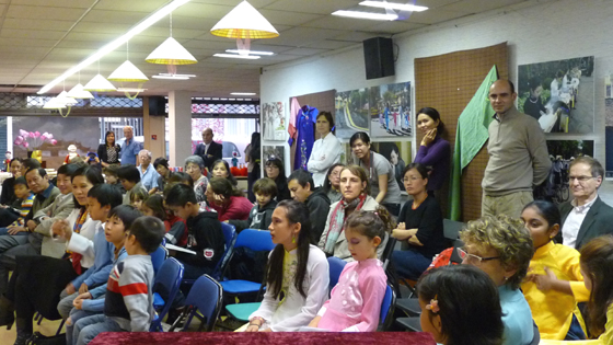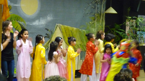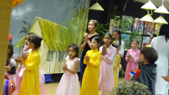Cảnh đầu tiên đập vào mắt tôi là những đầu kỳ lân, đèn lồng hình con thú đủ loại, kích cỡ khác nhau và những tà áo nho nhỏ xinh xinh được các cháu mặc để chuẩn bị cho buổi biểu diễn. Những câu hát, điệu múa thật vui nhộn dưới tiếng đàn oóc của cô giáo Diệu Thúy. Tôi gặp một cháu bé gái bụ bẫm chừng bốn tuổi, tay níu chặt áo mẹ, chăm chú nhìn và lắng nghe. Khi màn diễn kết thúc, tôi tiến lại gần, hỏi cháu bé có thích không, cháu nói « thích ạ ». Mẹ cháu, một cán bộ sang Pháp làm nghiên cứu sinh cho biết, chị rất thích cho con đến dự các buổi lễ truyền thống Việt Nam : « Tôi muốn cho cháu biết thêm về tết Trung Thu, và đây cũng là cơ hội để cháu giao lưu và tìm hiểu thêm về những gì mà chính bản thân tôi, đôi khi cũng không thể giải thích hết cho cháu hiểu được… »