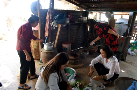 Không khí ở nhà cụ Hồng thật nhộn nhịp và đầm ấm. Trong khi chị em phụ nữ đi chợ, nấu ăn thì ở nhà cánh đàn ông sửa soạn, lau chùi bàn thờ.Gian bếp nhỏ của nhà cụ Hồng bắt đầu náo nhiệt hẳn lên. Các chị tranh thủ chế biến từng loại thực phẩm thường thấy trong ngày Tết như gà, giò, bánh chưng, đu đủ xanh, hành, rau cải….để làm sao kịp giờ mà thức ăn vẫn nóng sốt. Vừa làm mọi người vừa hỏi thăm chuyện nhà chuyện cửa, chuyện làm ăn của nhau. Trong gian bếp nhỏ, tiếng chuyện trò, cười nói râm ran. Chị Huyền, cho biết: “Trong 1 năm mới mong ước là anh em, bà con về gặp nhau, đi đâu ở xa cũng về gặp nhau để đón năm mới vì mình sinh ở đây. Ông bà ngày xưa muốn về quê thì kể lại cho con cháu nghe là Tết ông bà ở quê làm thế nào… Dù đi làm ở đâu Tết cũng phải về Xiêng Vang chúc tết bố mẹ và bà con. Tết ở Xiêng Vang là vui nhất vì ở Xiêng Vang có 1 tình cảm thương mến nhau. Ngày Tết trông thấy nhau là mừng rồi nên người nào cũng thích về Xiêng Vang ăn Tết.”