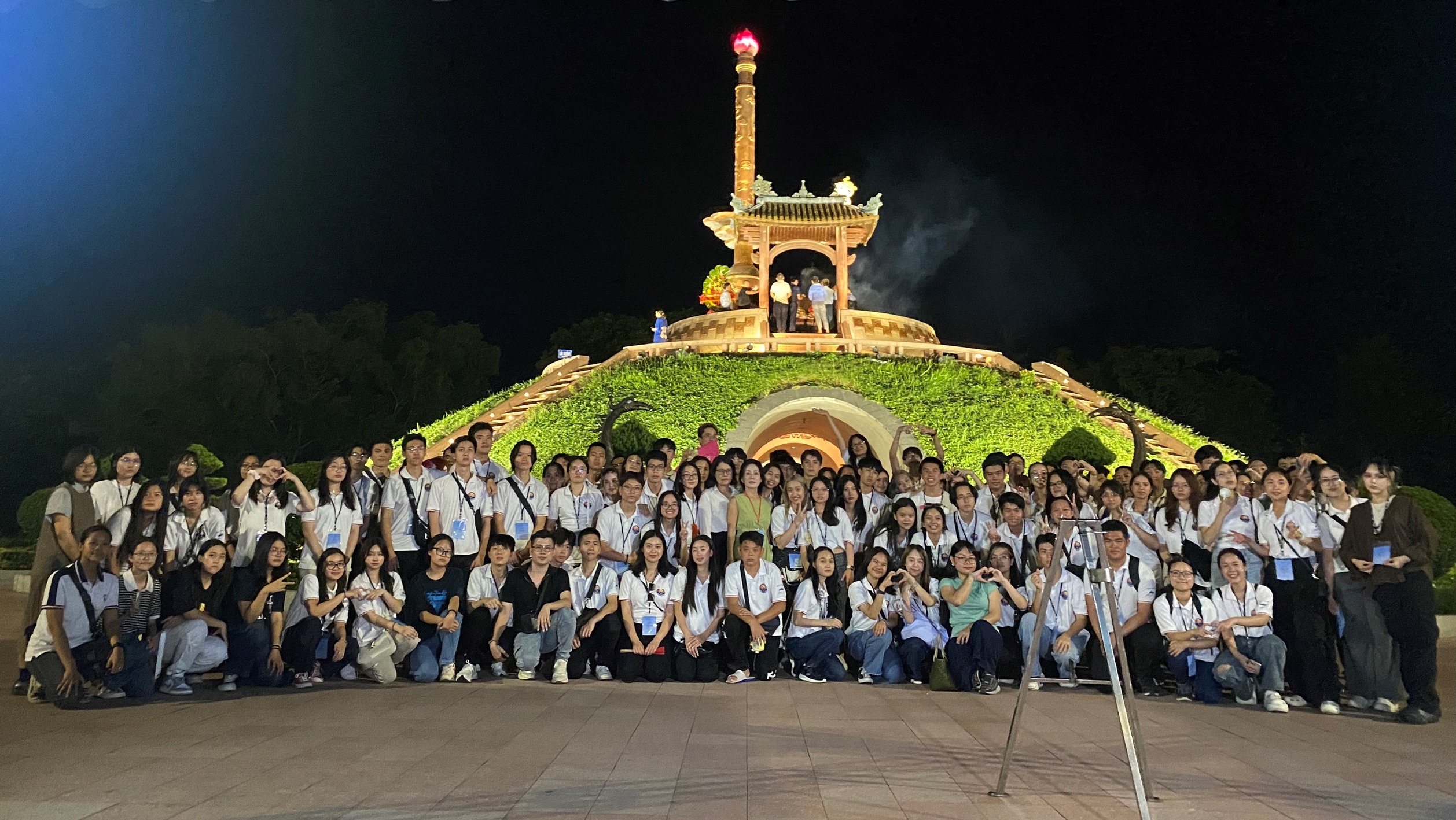 Đoàn Trại hè Việt Nam 2023 chụp ảnh trước Đài tưởng niệm trung tâm Thành cổ Quảng Trị. Ảnh: Ngọc Tư |
