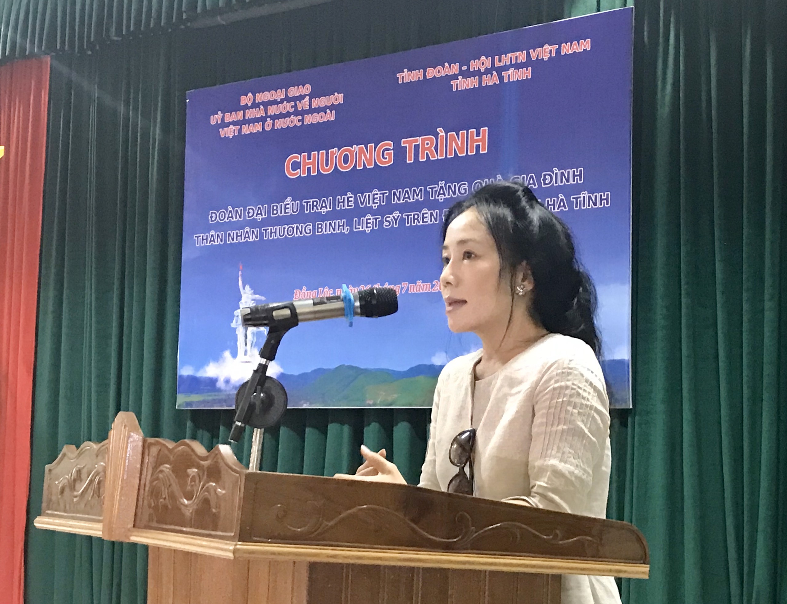 Bà Vũ Thanh Huyền, Phó Vụ trưởng Vụ Thông tin – Văn hoá, Uỷ ban Nhà nước về người Việt Nam ở nước ngoài, phát biểu tại buổi tặng quà cho gia đình thân nhân thương binh, liệt sỹ tại Hà Tĩnh. |