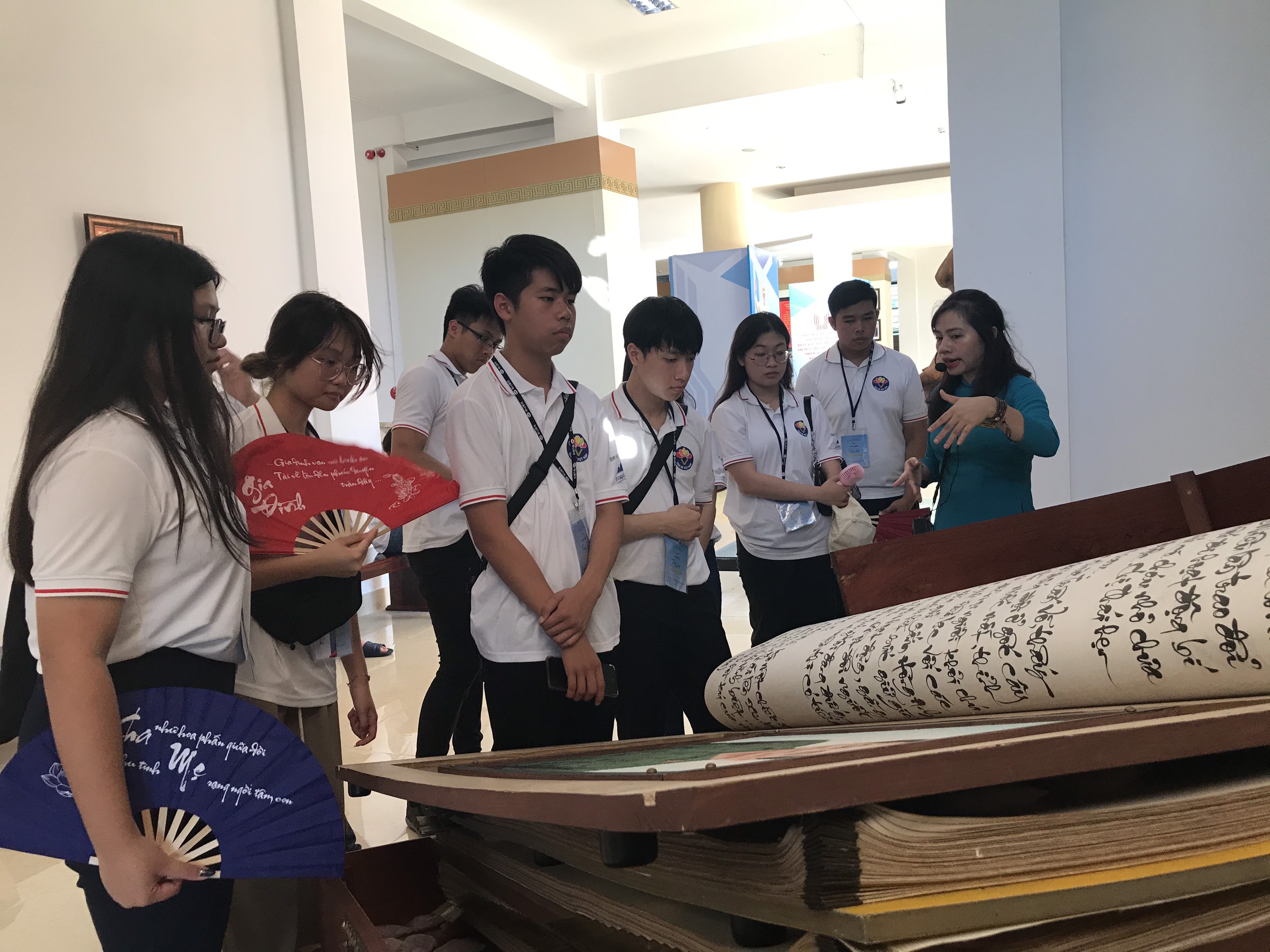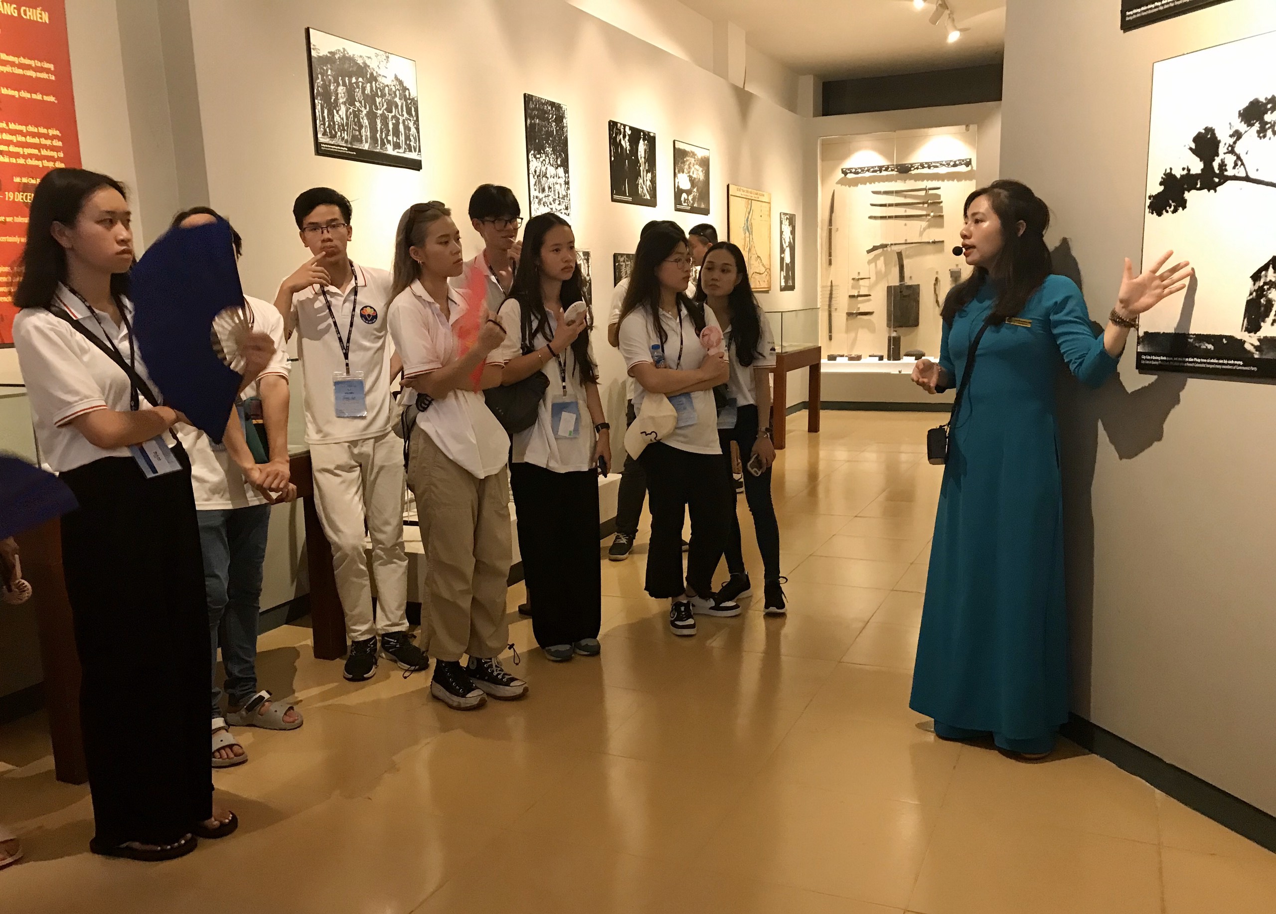 Kiều bào trẻ nghe thuyết minh tại bảo tàng tỉnh Quảng Bình. |