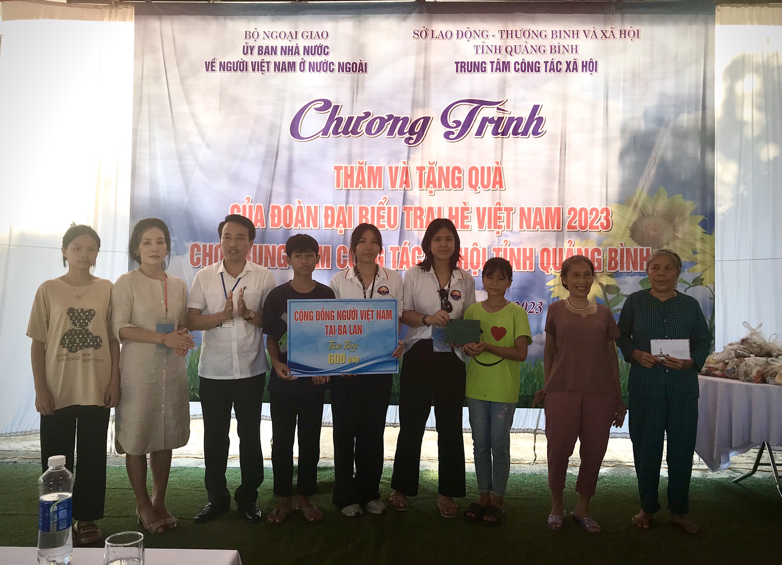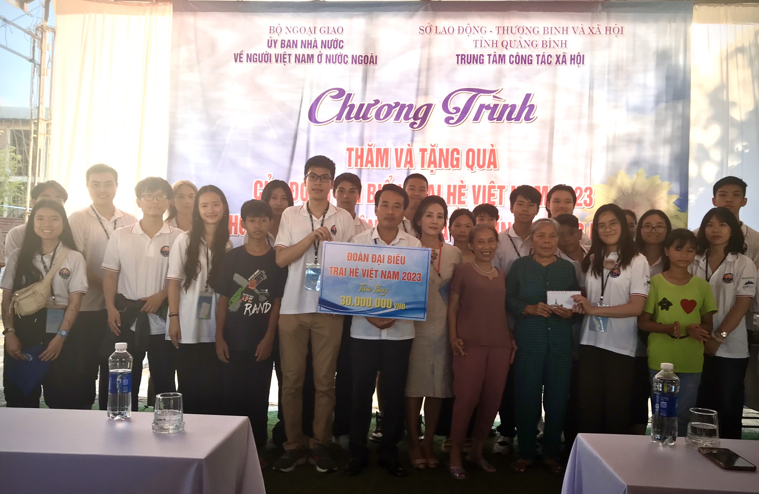 Đoàn cũng đến thăm và tặng quà cho các cụ già neo đơn và các em nhỏ của Trung tâm Công tác xã hội tỉnh Quảng Bình. Tại đây, đoàn đại biểu Trại hè Việt Nam 2023 tặng Trung tâm 30 triệu đồng. Cộng đồng người Việt Nam tại Ba Lan tặng 600 USD cho Trung tâm Công tác xã hội tỉnh Quảng Bình.