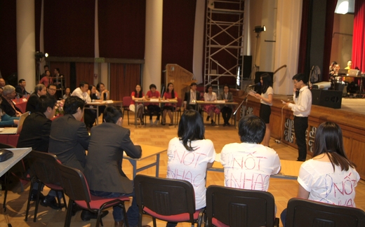 Các thí sinh tham gia phần thi hùng biện ( Thứ hai đến thứ sáu từ trái sang).