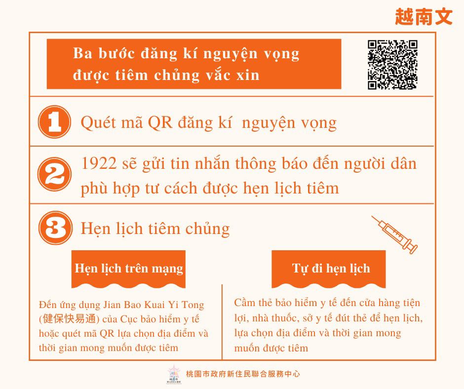 Ông Trịnh Văn Xán cũng khẳng định, theo chỉ dẫn của Bộ Phúc Lợi Y tế Đài Loan (Trung Quốc), tân di dân, lưu học sinh, lao động nước ngoài, bất kể đến từ quốc gia nào, chỉ cần có thẻ bảo hiểm là có thể thực hiện tiêm chủng vaccine miễn phí. Đã có giao diện internet đăng ký đặt lịch hẹn tiêm chủng, thành phố Đào Viên cũng đang thúc đẩy phương pháp thao tác bằng tiếng Việt, thông báo cho lao động nước ngoài, tân di dân biết cách làm thế nào để đăng ký tiêm chủng vắc -xin.