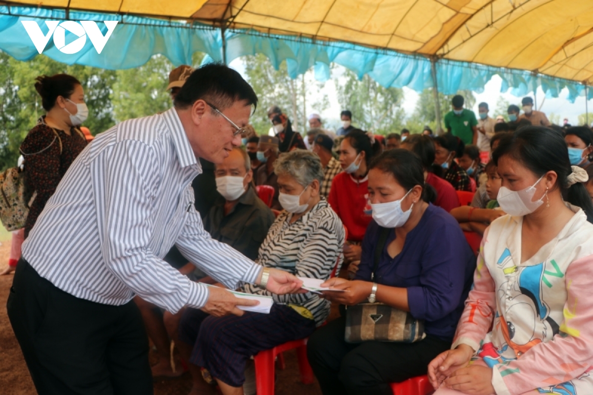 Ông Võ Thành Chất, Phó Chủ nhiệm Ủy ban về người Việt Nam ở nước ngoài thành phố Hồ Chí Minh tặng quà cho bà con gốc Việt và người Campuchia có hoàn cảnh khó khăn |