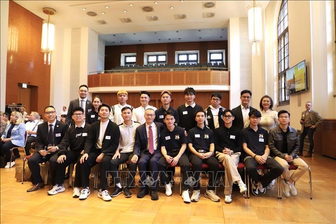 Đại sứ Vũ Quang Minh (đeo cà vạt đỏ) chụp ảnh cùng các thực tập sinh Việt Nam học nghề lái tàu tại Đức. Ảnh: Phương Hoa/TTXVN |