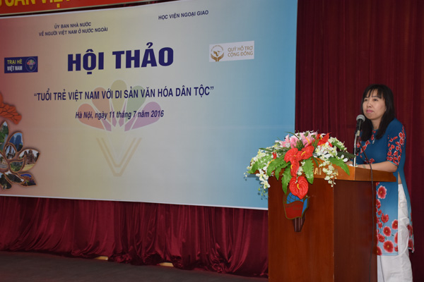 Phát biểu tại buổi hội thảo, bà Lê Thị Thu Hằng, Vụ trưởng Vụ Thông tin - Văn hóa, Ủy ban cho biết: Cho đến nay, Việt Nam đã có rất nhiều di sản văn hóa vật thể và di sản văn hóa phi vật thể được UNESCO công nhận là di sản văn hóa của nhân loại và di sản văn hóa của thế giới. Ngày nay, bên cạnh việc khai thác, sử dụng các di sản thì việc quy hoạch bảo tồn và phát huy giá trị di sản hết sức quan trọng, cần sự tham gia của cả cộng đồng. Chính vì vậy, trong khuôn khổ Chương trình Trại hè Việt Nam 2016, Ủy ban phối hợp với Học viện Ngoại giao tổ chức buổi hội thảo với chủ đề: “Tuổi trẻ Việt Nam với di sản văn hóa dân tộc” với mong muốn các đại biểu kiều bào cùng thanh niên, sinh viên trong nước trao đổi để tìm hiểu, nâng cao hiểu biết về văn hóa dân tộc, đồng thời nâng cao nhận thức về vai trò, trách nhiệm của mình trong việc gìn giữ và phát huy những nét văn hóa đặc sắc của dân tộc.