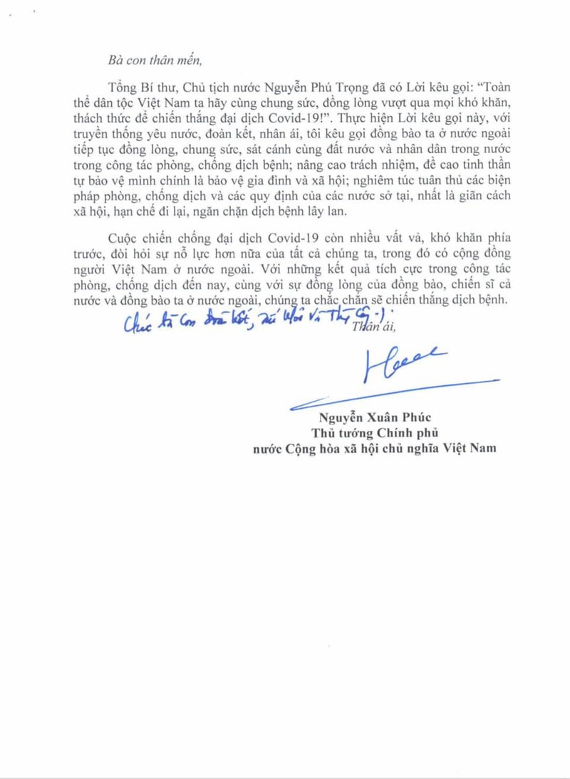 Tôi trân trọng tinh thần đoàn kết, nhân ái, tương trợ, giúp đỡ quý báu đó, đồng thời biểu dương nỗ lực của kiều bào, người lao động, sinh viên, học sinh Việt Nam đang sinh sống, làm việc, học tập ở các quốc gia vượt qua khó khăn do dịch bệnh gây ra, tuân thủ quy định của nước sở tại để bảo vệ mình và cộng đồng. Những hành động đó thể hiện truyền thống đoàn kết, lòng yêu nước, nhân nghĩa và tinh thần vượt khó của dân tộc ta, nhân dân ta.