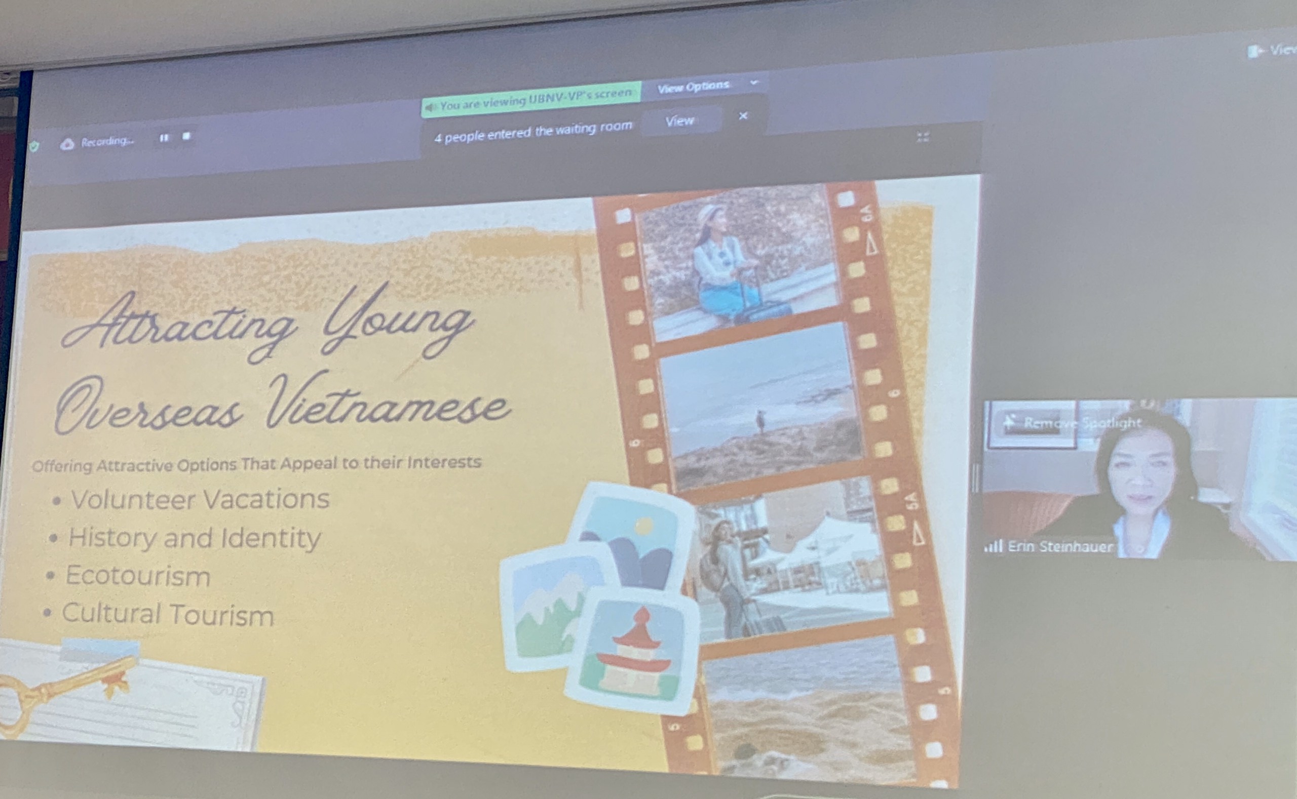 Từ đầu cầu Mỹ, bà Erin Phương, Chủ tịch Hội Châu Á, kiều bào Mỹ, trình bày tham luận “Phát huy vai trò của kiều bào đối với khách du lịch vào Việt Nam – Nhu cầu của kiều bào Mỹ đối với du lịch nguồn cội: Khó khăn và giải pháp”. Bà cho rằng: “Sự gắn bó với một nơi chốn, một vị trí địa lý, cảm giác hoài niệm hay sự kết nối tình cảm của một người với một ngôi trường có nhiều ý nghĩa với họ. Chỉ đơn thuần có mặt ở Việt Nam là đã gợi ra cảm xúc khác biệt, tôi có thể ăn một tô phở ở Washington D.C nhưng sẽ rất khác biệt và rất thật khi tôi ăn phở tại Việt Nam”.
