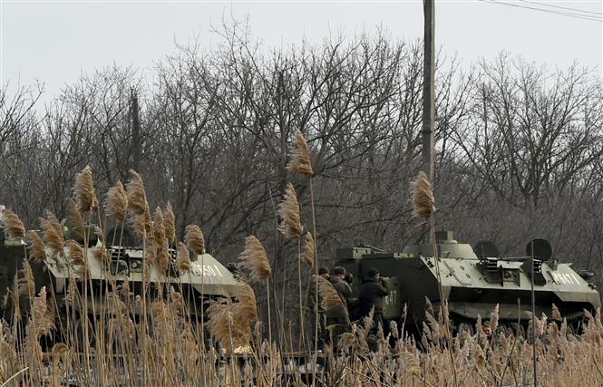 Xe quân sự của Nga được triển khai ở vùng Rostov, miền Nam nước Nga, giáp với Cộng hòa nhân dân Donetsk (DPR) tự xưng ở miền Đông Ukraine, ngày 23/2/2022 -Ảnh: AFP/TTXVN |