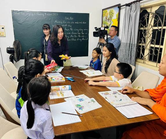 Thứ trưởng Lê Thị Thu Hằng thăm lớp học tiếng Việt tại Chùa Phật Tích. |