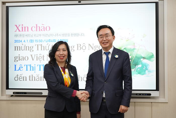 Ngày 1/4/2024, trong khuôn khổ chuyến thăm và làm việc tại Hàn Quốc, Thứ trưởng Bộ Ngoại giao Lê Thị Thu Hằng có chuyến thăm và làm việc với Tỉnh trưởng tỉnh Jeonbuk và Thị trưởng thành phố Naju - tỉnh Jeonlanamdo, ở Tây Nam Hàn Quốc.