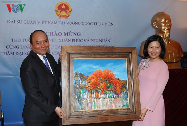 Đánh giá cao kết quả công tác của Đại sứ quán Việt Nam tại Thụy Điển trên lĩnh vực ngoại giao, đối ngoại, bảo trợ công dân, Thủ tướng Nguyễn Xuân Phúc cũng hoan nghênh Đại sứ quán đã làm tốt việc xúc tiến thương mại hai nước và hoạt động đầu tư của Thụy Điển vào Việt Nam.