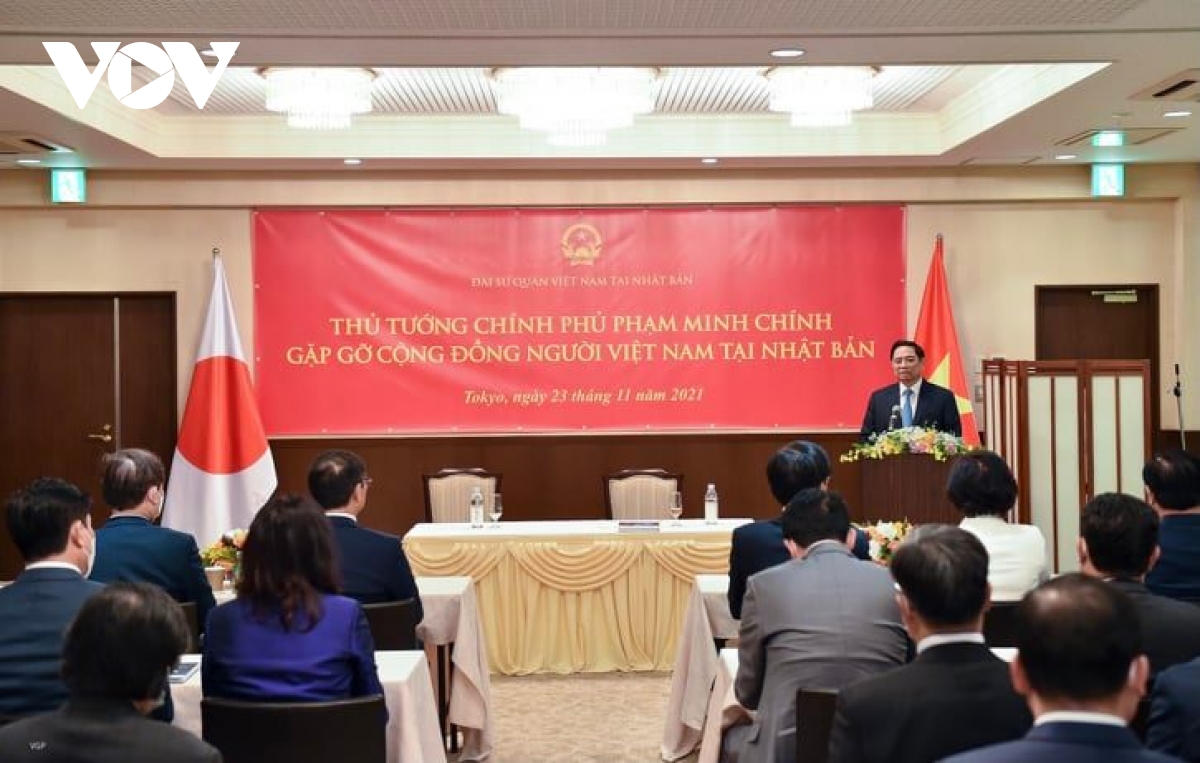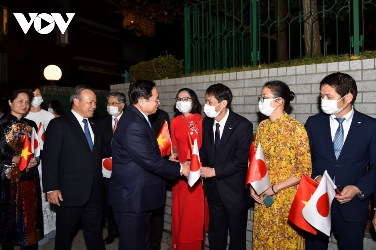 Thủ tướng đánh giá, cộng đồng người Việt Nam ở Nhật Bản lớn mạnh, trưởng thành rất nhanh; hy vọng sau chuyến thăm này, hai nước sẽ có cải thiện về giao thương, đi lại... sau một thời gian bị ảnh hưởng bởi đại dịch Covid-19. Thủ tướng cũng đánh giá cao Đại sứ quán Việt Nam tại Nhật Bản đóng góp tích cực vào phát triển quan hệ hai nước, chăm lo công tác kiều bào. Thủ tướng biểu dương tinh thần làm việc hăng say, hiệu quả Đại sứ quán Việt Nam và các Tổng lãnh sự tại Nhật Bản góp phần thu xếp chuyến thăm chính thức này; công tác vận động ủng hộ vaccine...