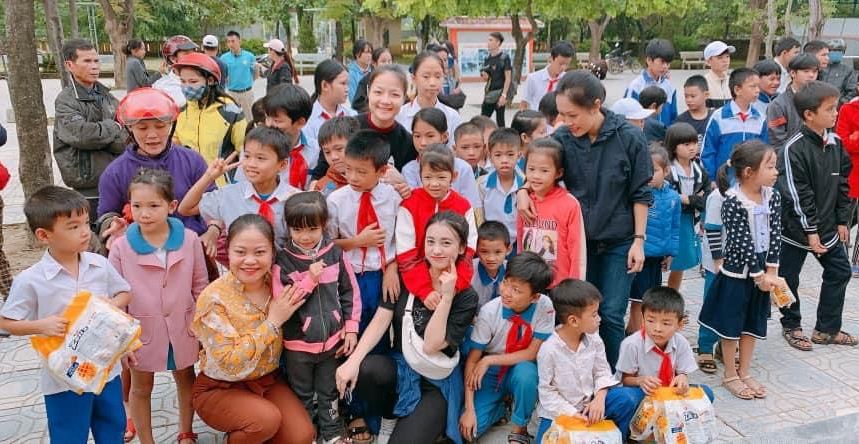 Alissa Phan Thị Hải Yến gửi đoàn MC Hoàng Trang, MC Thúy Quỳnh, DR Hoàng Tuấn và các mạnh thường quân tặng quà cho các học sinh vùng lũ. |
