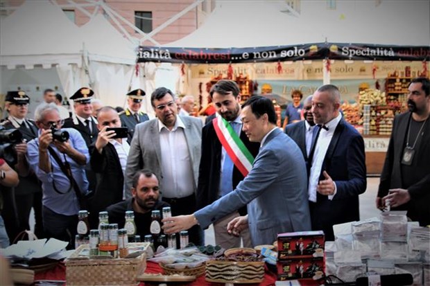 Đại sứ Dương Hải Hưng giới thiệu tới quan chức chính quyền thành phố Rieti, vùng Lazio và khách tham quan sản phẩm của Việt Nam tại Hội chợ. Ảnh: Trường Dụỵ/TTXVN |