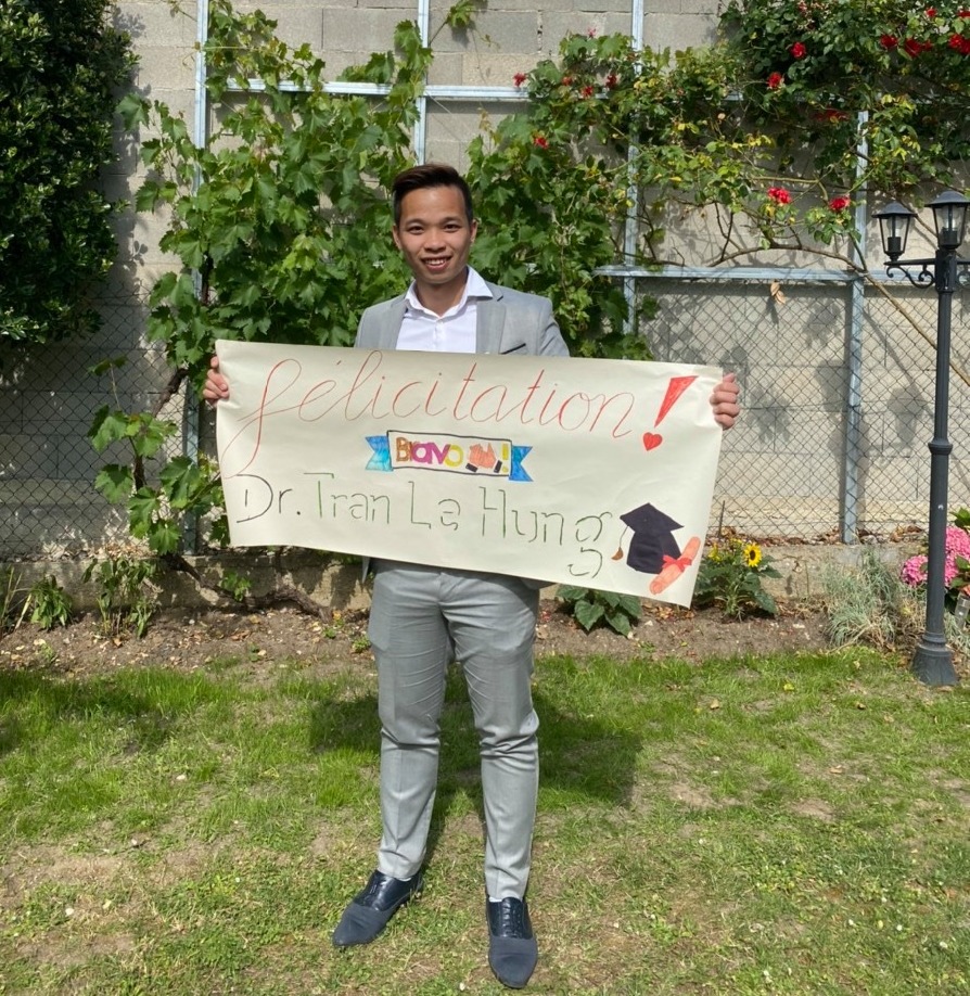 Đầu tháng 3/2020, dịch Covid 19 bùng phát tại Pháp cũng là thời điểm Trần Lê Hưng chuẩn bị bảo vệ luận án tiến sĩ tại Đại học Paris Est, một trong ngôi trường nổi tiếng của Pháp. “Phát triển tà vẹt tích hợp vào duy tu và bảo trì đường sắt" là đề tài mà anh theo đuổi nghiên cứu gần 4 năm qua. Với Hưng, buổi bảo vệ này là một kỷ nhiệm vô cùng đặc biệt khi diễn ra trực tuyến chỉ có anh thuyết trình cùng 3 thành viên hội đồng giáo sư hướng dẫn và phản biện, trước những ô hình ảnh nhỏ xíu trên máy tính, trong suốt 3 giờ đồng hồ: “Phải nói rằng, tôi khá lo lắng và hụt hẫng. Chỉ có tôi và chiếc máy tính. Bố mẹ cũng như nhiều người bạn ở Pháp không thể tham dự được. Nhưng bù lại thì việc phát trực tuyến buổi bảo vệ cũng giúp tôi xóa đi phần nào cảm giác đó, vì tôi biết mọi người luôn đồng hành cùng tôi, dù ở khoảng cách rất xa về mặt đia lý. Hơn nữa, về mặt tích cực thì việc bảo vệ trực tuyến giúp buổi bảo vệ của tôi tới được những người bạn ở khắp năm châu.”
