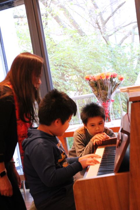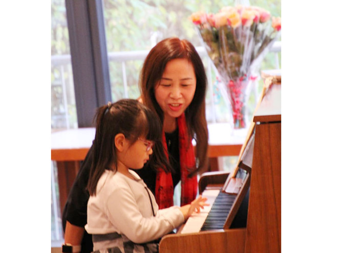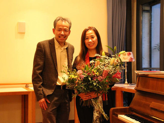 Nghệ sĩ piano Bùi Thanh Thảo bên học trò trong buổi biểu diễn