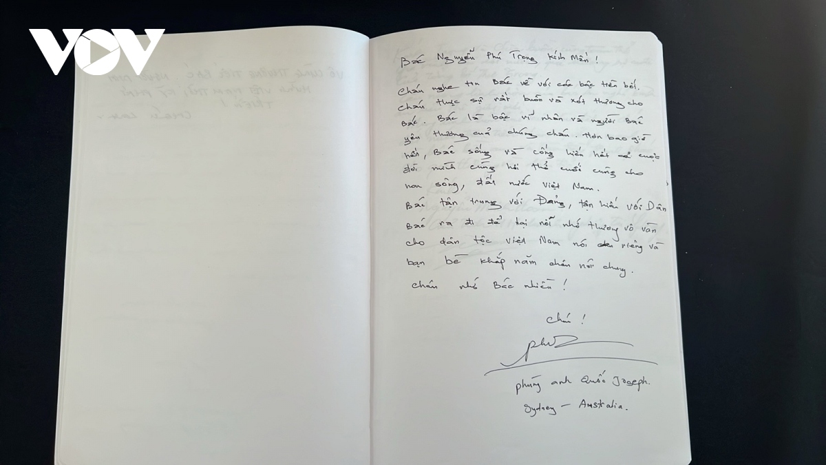 Bên cạnh đại diện các phái đoàn ngoại giao, nhiều bà con người Việt tại Australia cũng dành thời gian đến viếng và chia buồn trước sự ra đi của Tổng Bí thư Nguyễn Phú Trọng và để lại nhiều dòng tâm tư trong sổ tang.