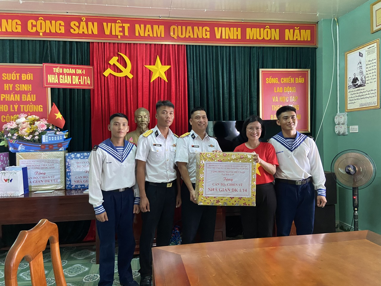 Chị Vũ Thị Vân Anh đại diện cho cộng đồng người Việt tại Hà Lan gửi tặng quà tới cán bộ, chiến sĩ Nhà giàn DK-I/14. |