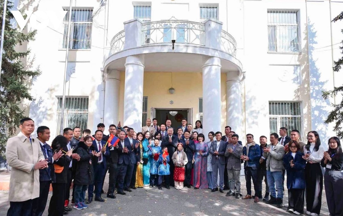 Tổng Bí thư, Chủ tịch nước Tô Lâm chụp ánh cùng cán bộ, nhân viên Đại sứ quán Việt Nam và cộng đồng người Việt tại Mông Cổ. Ảnh: VOV |