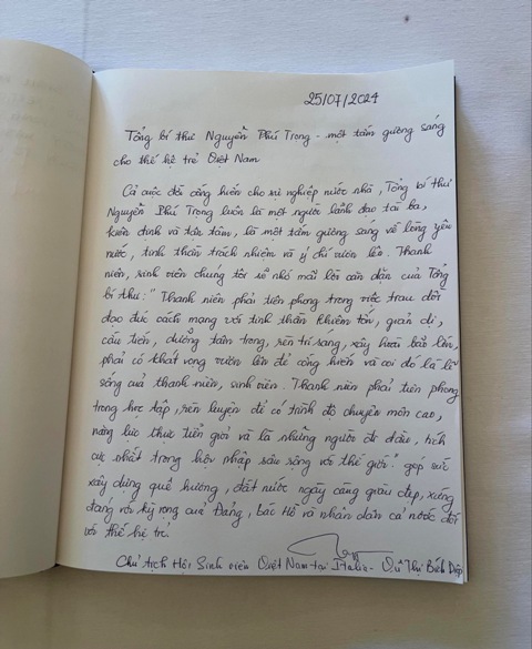 Cả cuộc đời cống hiến cho sự nghiệp nước nhà, Tổng Bí thư Nguyễn Phú Trọng luôn là một người lãnh đạo tài ba, kiên định và tận tâm. Thanh niên chúng tôi còn nhớ mãi câu nói của Tổng Bí thư rằng: "Trên ngực áo này không một tấm huân chương. Dưới làn vải áo mỏng này có một trái tim sâu sắc". Câu nói ấy không chỉ thể hiện lòng khiêm nhường mà còn thể hiện tình yêu đất nước sâu sắc và tinh thần cống hiến không ngừng nghỉ.