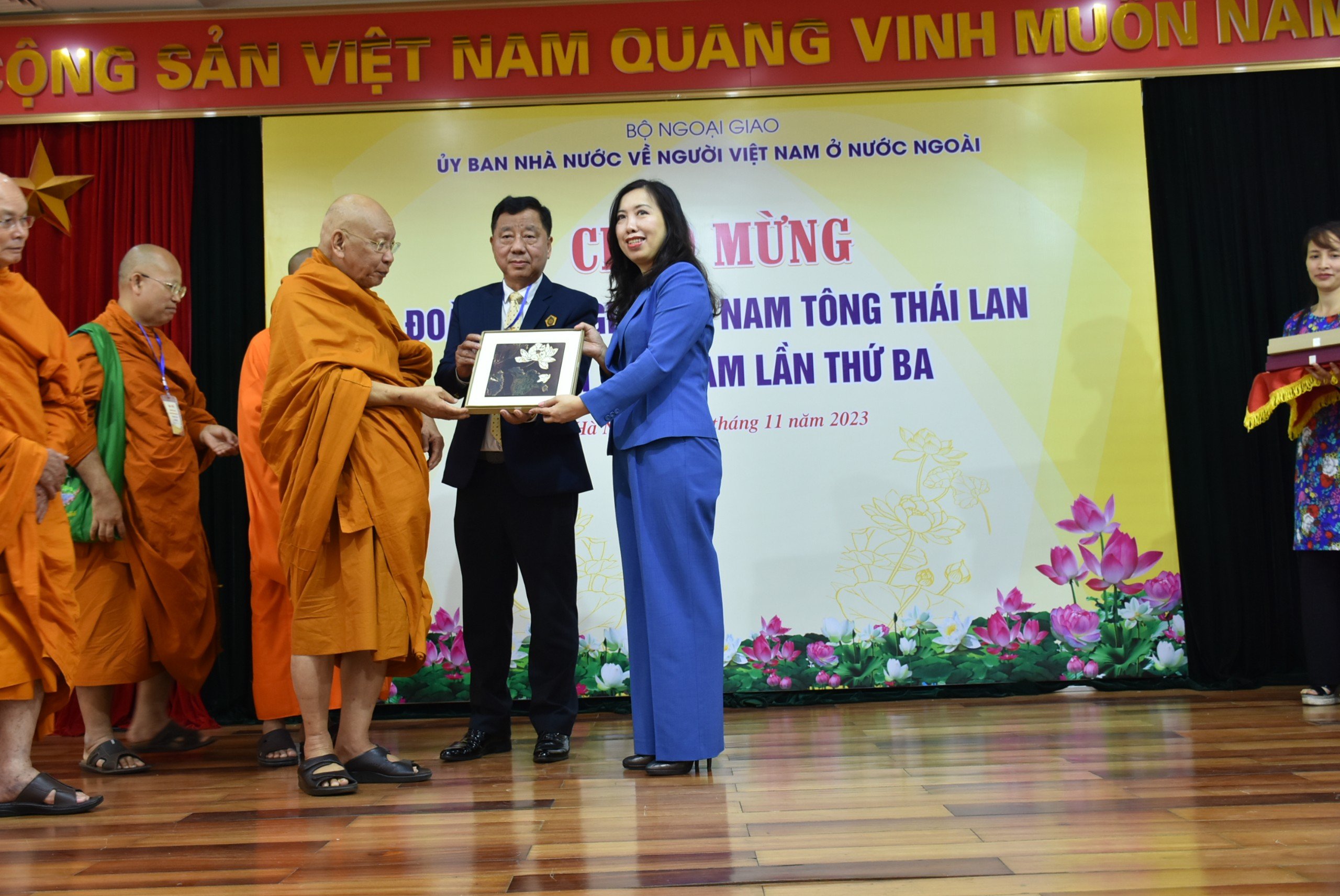 Thứ trưởng Bộ Ngoại giao Lê Thị Thu Hằng tặng quà lưu niệm cho hòa thượng Thái Lan. |