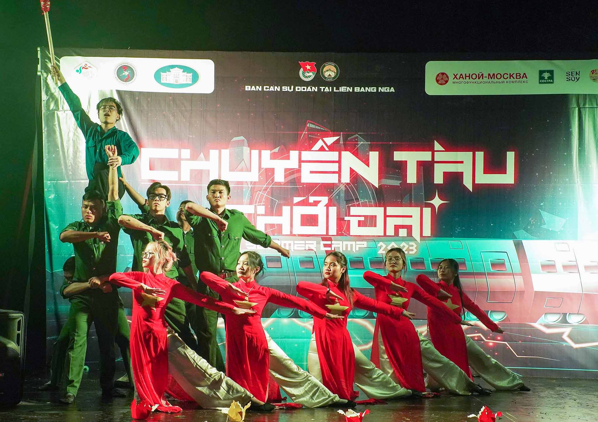 Tiết mục văn nghệ Ca ngợi Tổ quốc trong đêm lửa trại Trại hè sinh viên Việt Nam toàn Liên bang Nga (SMC 2023). Nguồn: TTXVN |