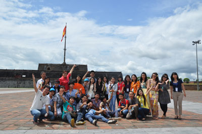 Các đại biểu Trại hè chụp ảnh kỷ niệm trước Kỳ đài đối diện Ngọ Môn. (Ảnh:quehuongonline)